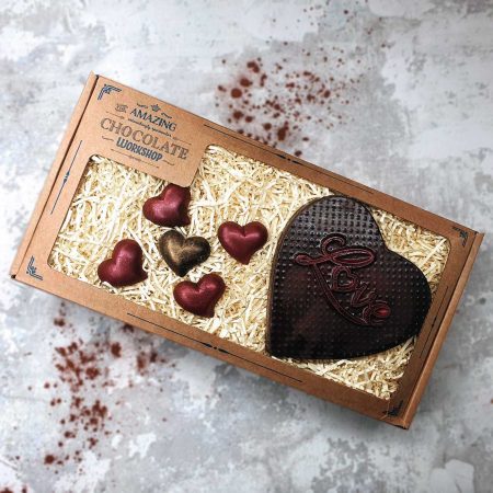 Stort kärlekshjärta i mörk choklad & 5 små hjärtan presentask