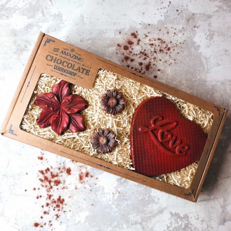 Stort rött kärlekshjärta choklad & blommor presentförpackning