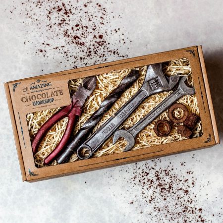 Skruvmejsel, skiftnyckel, tång och borr verktygsset presentask med choklad