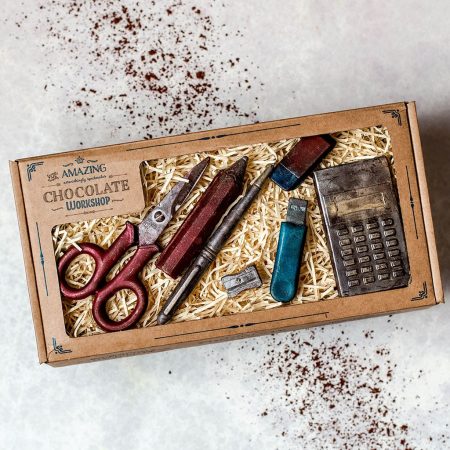 Chokladpresentset för lärare eller elev – USB, miniräknare, penna, penna, vässare, gummi och saxask